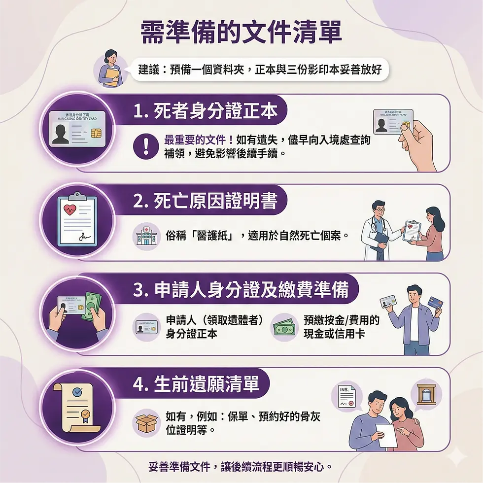 當情況稍為穩定後,可由一位較有精力的家屬,開始整理以下文件。建議預備一個資料夾,將正本與至少三份影印本妥善放好,日後前往入境處申請死亡證或辦理手續會較順利。