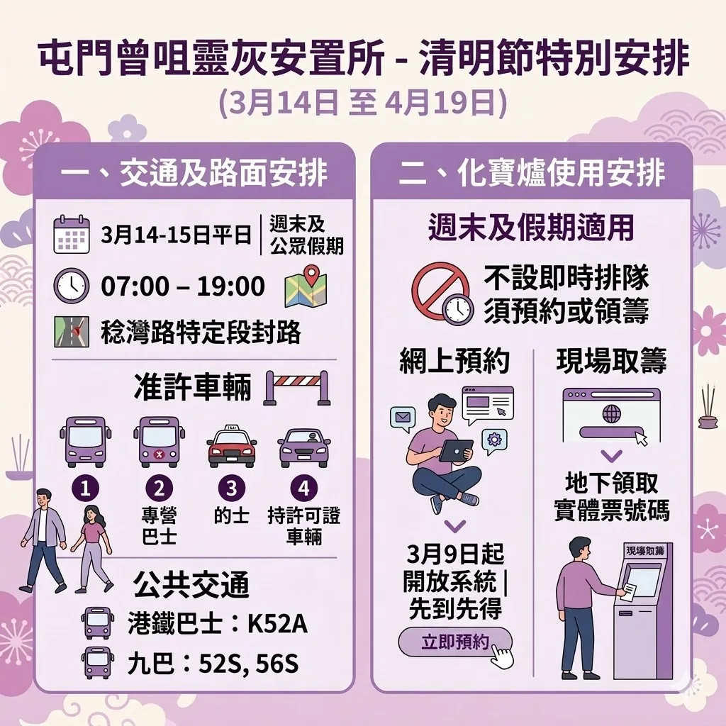 曾咀及新廈靈灰安置所於3月14日至4月19日週末及公眾假期實施預約或領籌制度。曾咀網上預約系統自3月9日起開放,新廈自3月7日起開放,均透過食物環境衞生署網頁登記,先到先得。未有預約者可於現場地下領取實體票號。