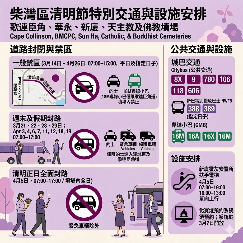 清明掃墓紀念先人,安全第一!請預早出發、攜帶水食、遵守現場指示,並使用「香港出行易」查實時路況。祝掃墓順利,平安歸來。若有更新,本文將持續跟進官方消息。