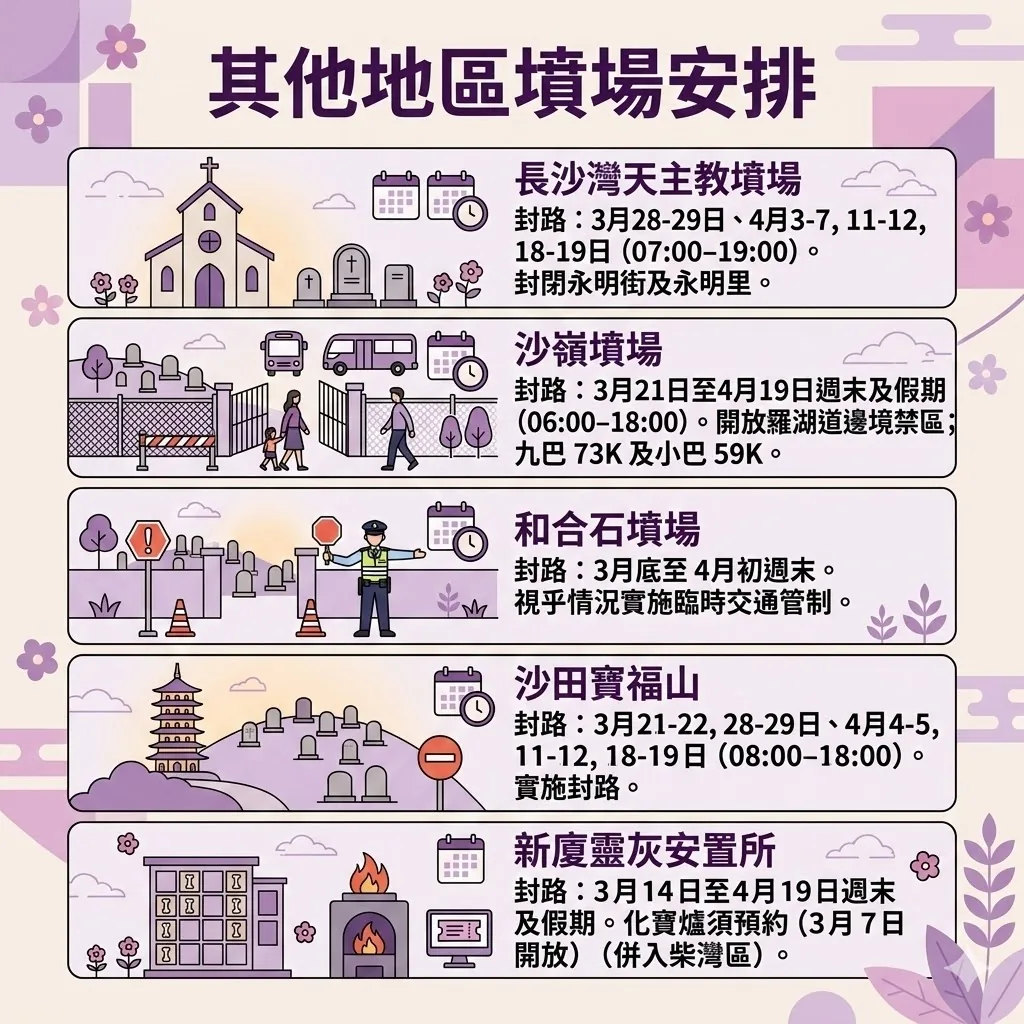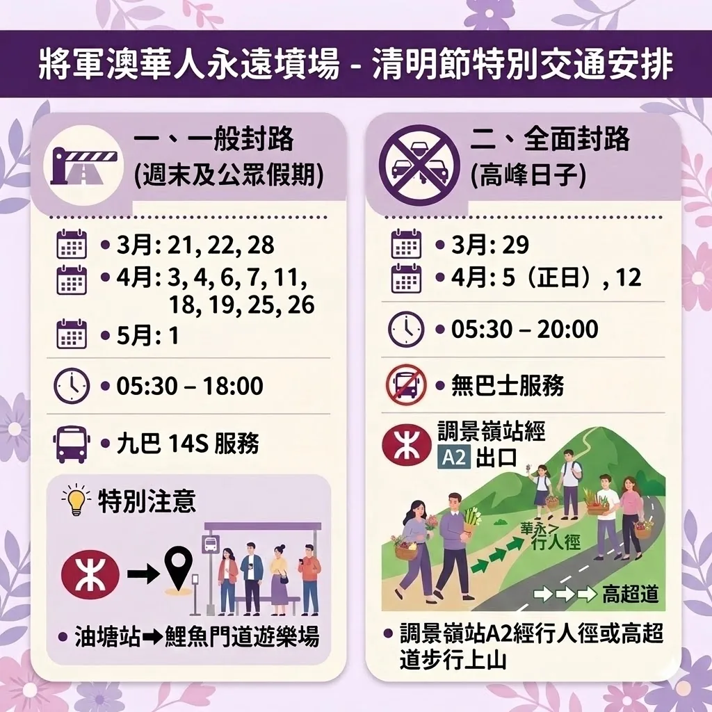 2026年清明節正日為4月5日(星期日)。屆時多區墳場實施全面封路,建議市民避開高峰時段,或優先使用公共交通工具前往。