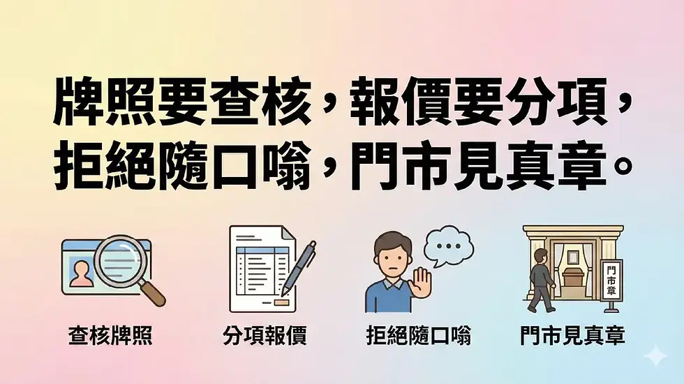 拒絕口頭承諾:要求提供「分項報價單」,清楚列明每一項服務(如棺木型號、堂倌工時、祭品數量)的單價。